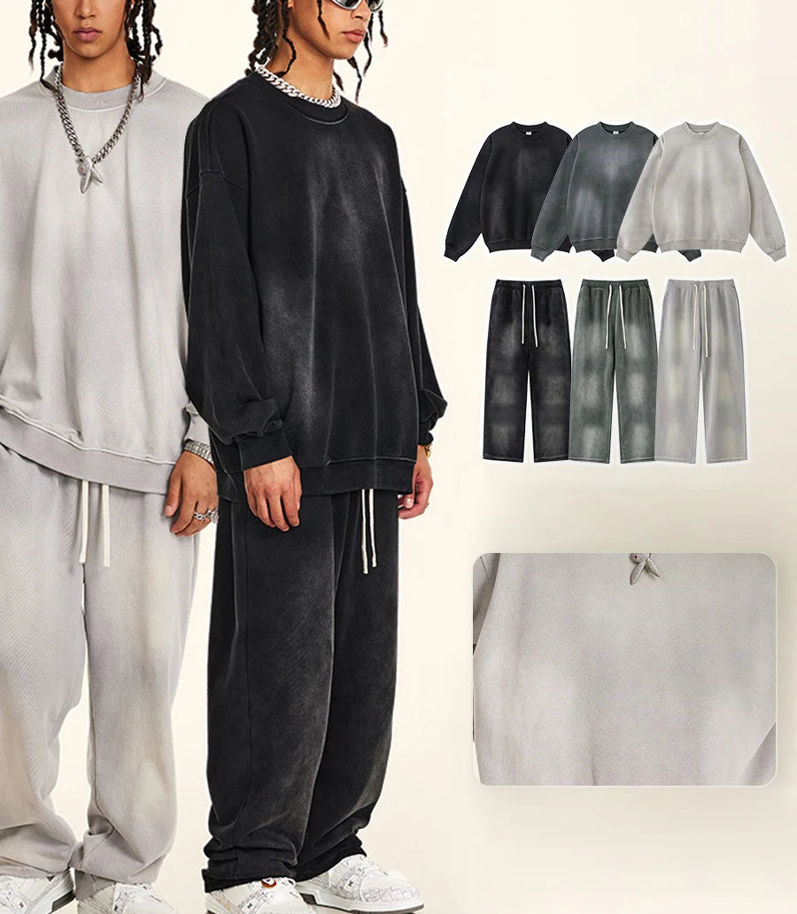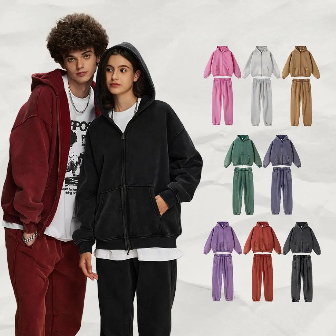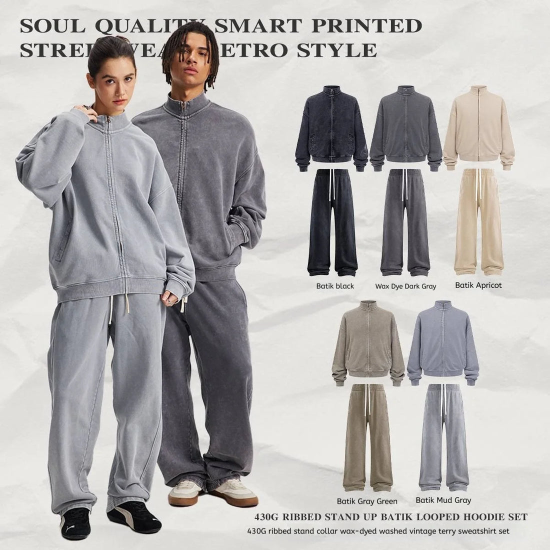 2pcs Vintage Style Heavyweight Hoodie Oversize Stand Collar Jacket Casual Sweatshirt
