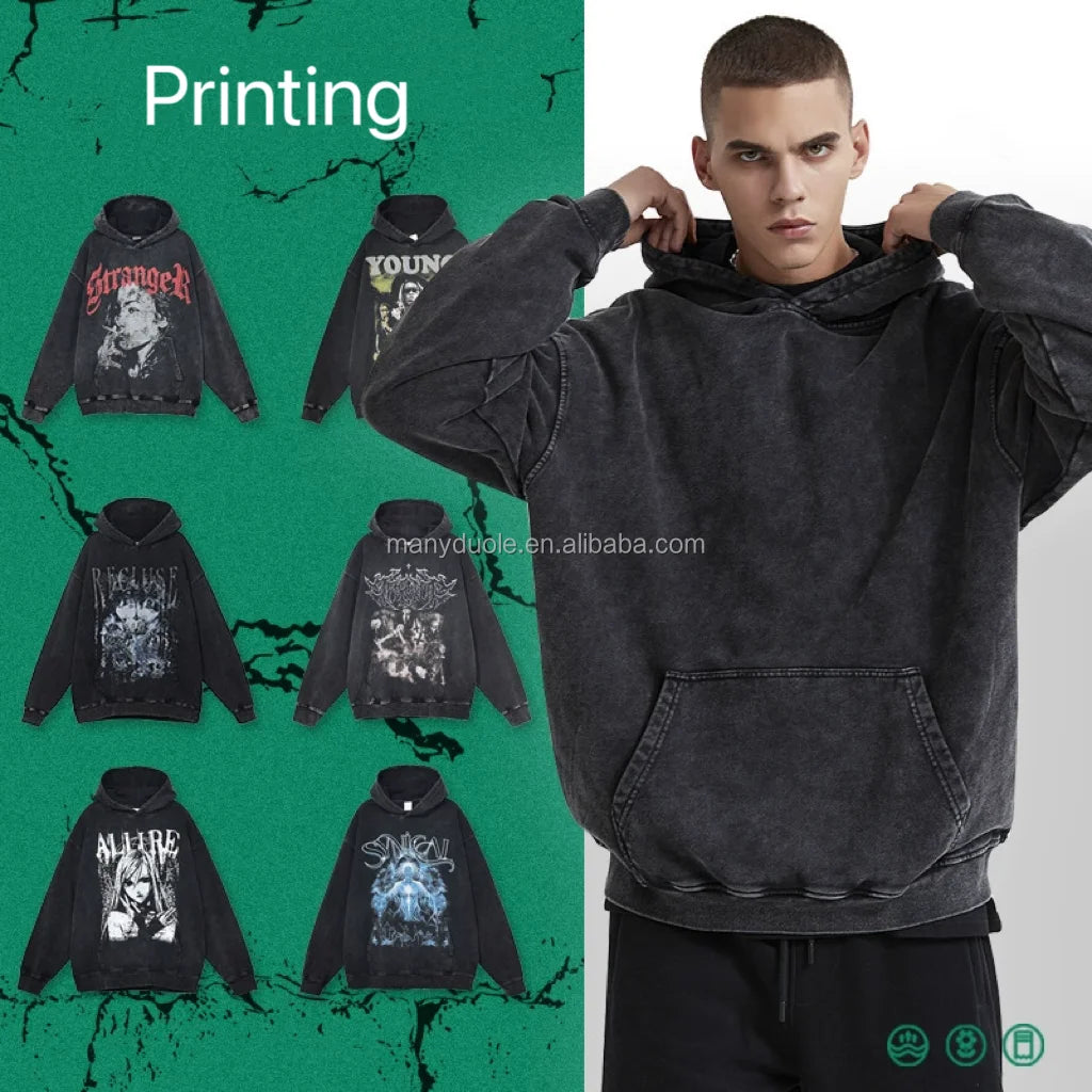 Custom Rhinestone Hoodie DTG Print 100% Cotton 400g Blank Wash Water Vintage Wash Men's Hoodie Acid Wash Casual Hip Hop Hoodie