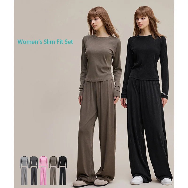 AU Women's Custom Slim Fit Washed Raglan Long Sleeve Crew Neck Casual Set Cotton Digital Printed Straight-Leg Pants for Autumn