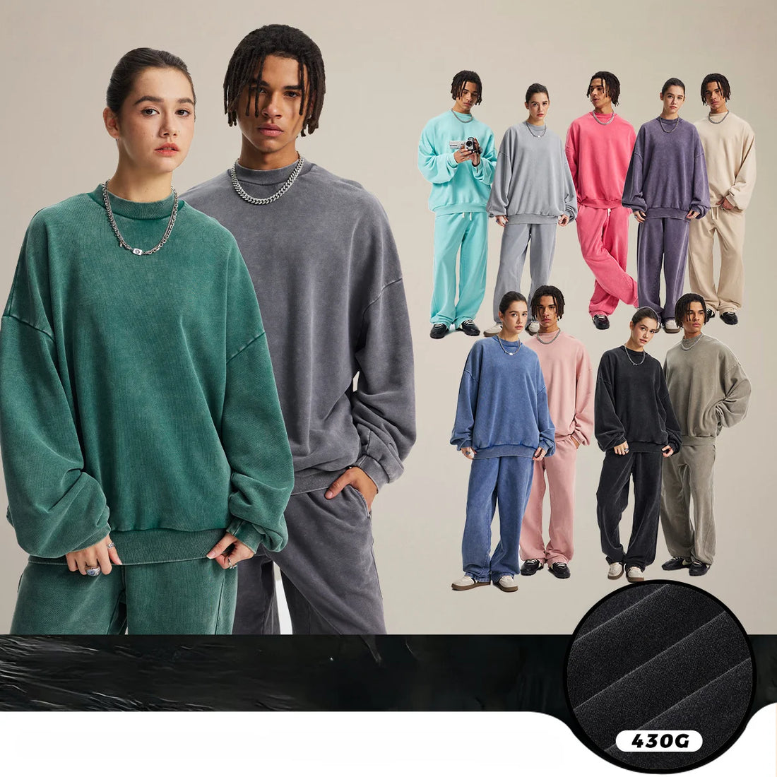 430gsm 100% Cotton French Terry Drop Shoulder Loose Fit Streetwear Vintage Washed Crew Neck Sweatshirt